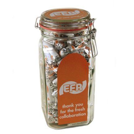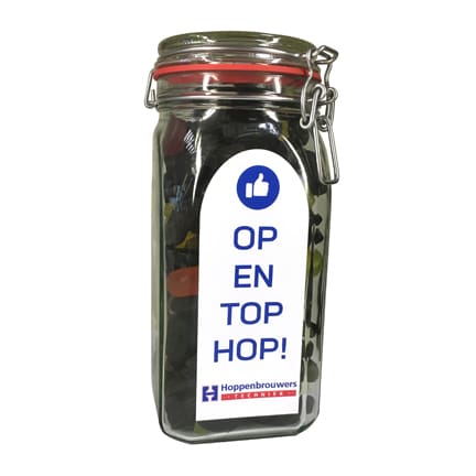 Met een smaakvol gevulde snoeppot met logo blijft u goed in zicht bij uw klanten 🙂