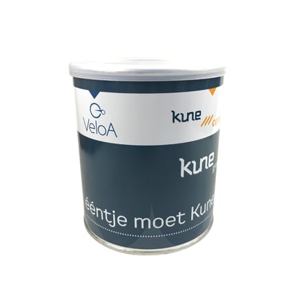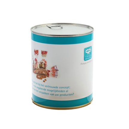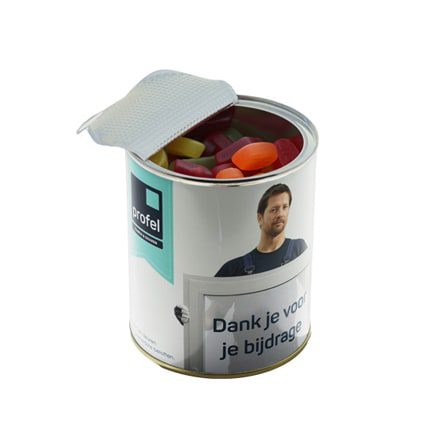 Gepersonaliseerd door middel van een full colour bedrukte wikkel om het snoepblik met uw bedrijfsnaam, logo of reclametekst, geheel naar eigen ontwerp.