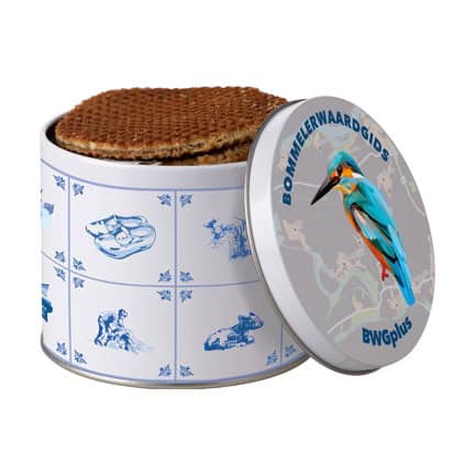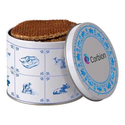 Delftsblauw Stroopwafelblik met eigen bedrukking op de deksel. Gepersonaliseerd met uw logo naar eigen full colour ontwerp.