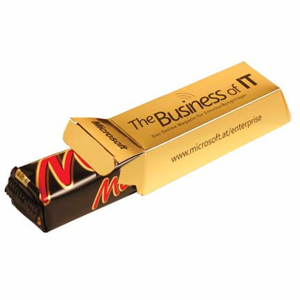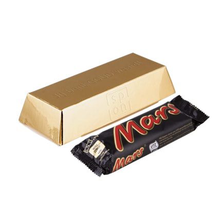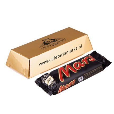 Bedrukt goudstaafje met 1 grote Mars reep als smaakvol weggevertje aan (toekomstige) klanten en relaties. Gepersonaliseerd met uw bedrijfslogo en vermelding van uw website, komt u hiermee positief onder de aandacht!