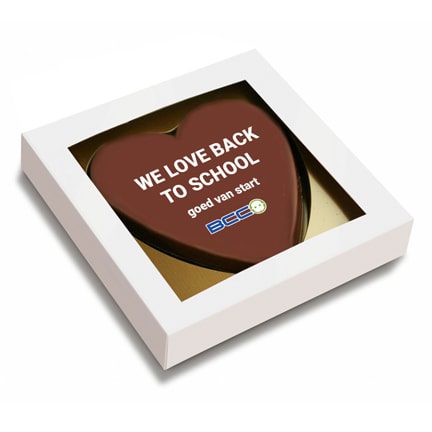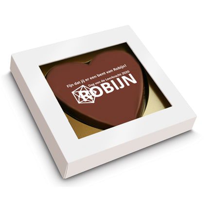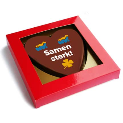 Chocoladehart met logo als smaakvolle give-away. Draagt u uw klanten een warm hart toe? Kies dan als relatiegeschenk een chocoladehart, daarmee maakt u zeker een liefdevolle indruk. Ook leuk voor Valentijn!