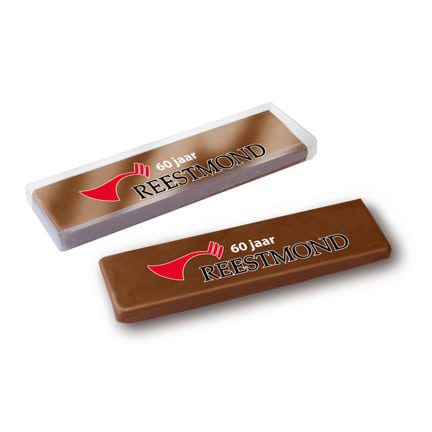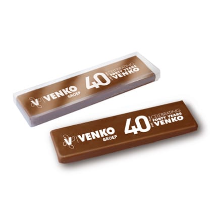 Keuze uit 2 smaken chocolade: puur of melk. De bedrukte chocoladereep wordt geleverd in een transparant doosje om beschadiging te voorkomen. Netto gewicht per cadeaureep is 75 gram.