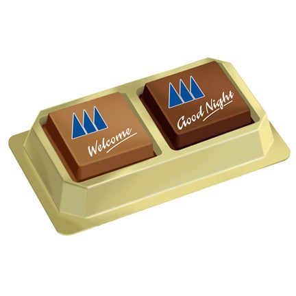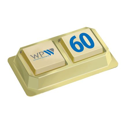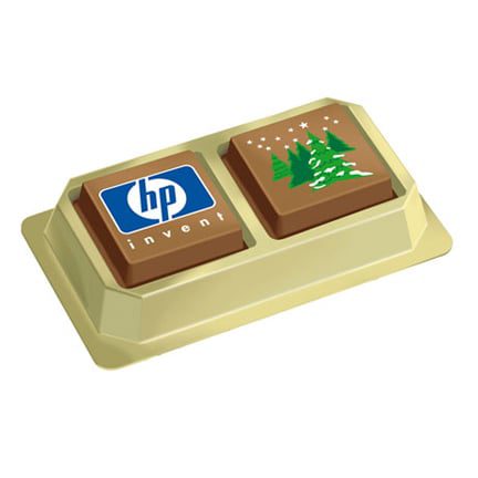 Op zoek naar een smaakvol relatiegeschenkje? Kies dan voor Logobonbons verpakt per twee stuks in een goudkleurig voetje met transparant deksel. Bedrukt met uw bedrijfslogo op de ene bonbon en bijvoorbeeld tekst op de andere bonbon, kunt u hiermee een smaakvolle boodschap overbrengen! Keuze uit 3 smaken chocolade of een combinatie hiervan: puur, melk of wit. Vulling: puur-hazelnoot, melk-espresso, wit-caramel crunch.