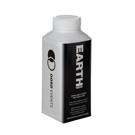 Kartonnen waterflesje met eigen label op 1 zijde van het vierkante flesje.