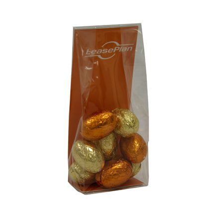 Wens uw klanten een Vrolijk Pasen met een transparant blokbodem snoepzakje gevuld met ca. 75 of 150 gram Paaseitjes. Leuk als gepersonaliseerd Paasgeschenkje voor uw klanten en zakenrelaties. Het snoepzakje wordt voorzien van een naar wens full colour bedrukt kopkaartje of bedrukte inlay.