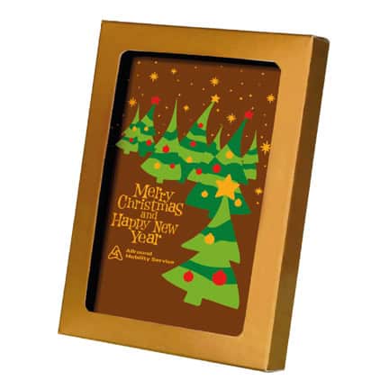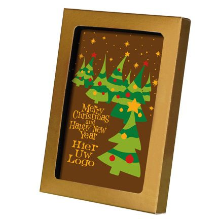 Wens uw klanten een vrolijk Kerstfeest met een bedrukte smaakvolle chocolade Kerstkaart! U kunt kiezen voor een standaard Kerstbedrukking of gepersonaliseerd met uw logo in de kleur geel. De chocoladeplak wordt verpakt in een geschenkdoosje met venster. Tegen meerprijs is een brievenbus verzenddoosje verkrijgbaar, zodat u de chocoladeplakken per post kunt versturen naar klanten en/of medewerkers.