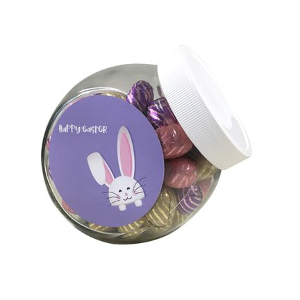 Verras uw klanten voor de Pasen met een smaakvol relatiegeschenk, een glazen snoeppot gevuld met zalige paaseitjes. De snoeppot is af te sluiten met een witte kunststof deksel. Deze snoeppot kan geleverd worden met full colour bedrukte vinyl stickers op de platte zijkanten. Uw Paasgeschenk wordt naar wens gepersonaliseerd met bijvoorbeeld uw logo, bedrijfsnaam of Paaswens, laat uw creativiteit de vrije loop!