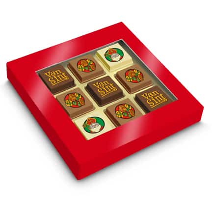 Kies dan Logobonbons, bedrukt met uw bedrijfslogo of standaard Sintafbeeldingen, zijn deze bonbons niet alleen heerlijk maar ook nog prachtig om te zien. Bijna te mooi om op te eten! Verpakt per negen stuks logobonbons in een doosje met transparante window. Bedrukking: standaard Sint bedrukking eventueel in combinatie met 3 witte bonbons met full colour logo.