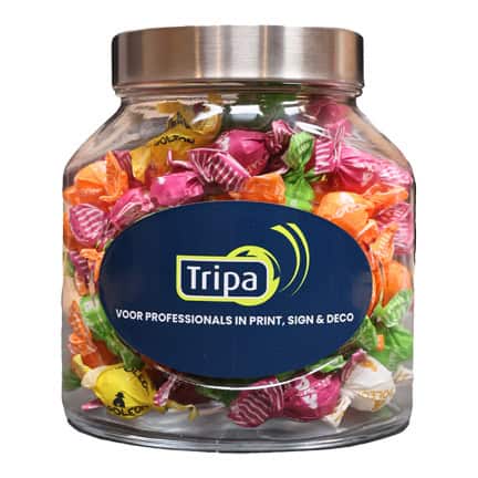 Stoere ovale glazen Snoeppot met zilverkleurige aluminium schroefdeksel. Aan beide zijkanten zit een ovale inkeping voor een full colour bedrukte sticker naar eigen ontwerp. 1 ontwerp voor beide zijkanten of 2 verschillende ontwerpen.
