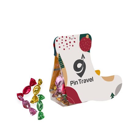 Papieren Kerstsok kaart met stazakje fruitzuurtjes. De papieren Kerstsok kan full colour bedrukt worden naar eigen Kerstontwerp met logo en Kerstwens 🙂