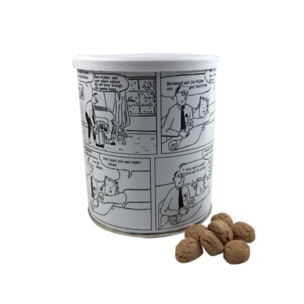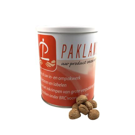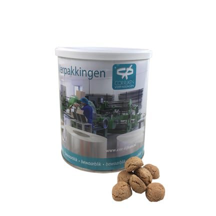 Pepernootblik met easy-peeling deksel (geen scherpe randen) en kunststof deksel voor het hersluiten. Gepersonaliseerd door middel van een full colour bedrukte wikkel om het conservenblik in uw eigen huisstijl met uw bedrijfsnaam, logo of reclametekst. Uw promotieblik gevuld met zalige kruidnootjes zal goed ontvangen worden door uw klanten voor Sinterklaas!