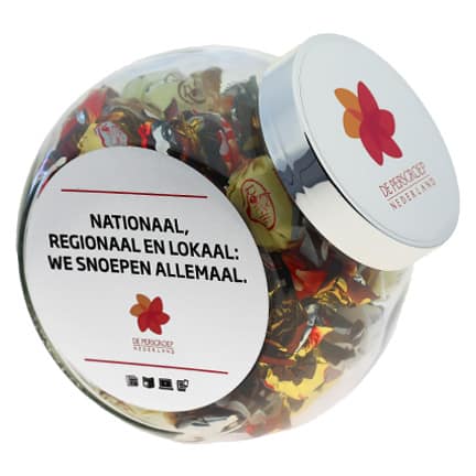 Grote schuinstaande glazen Snoeppot van 2 liter met hersluitbare schroefdeksel en gevuld met Paaseitjes als Paasgeschenk voor klanten. De deksel is van kunststof en leverbaar in wit, zwart of zilverkleurig. De snoeppot wordt voorzien van full colour bedrukte stickers met uw logo, bedrijfsnaam of promotietekst op de zijkanten. Optioneel is een full colour sticker op de deksel.