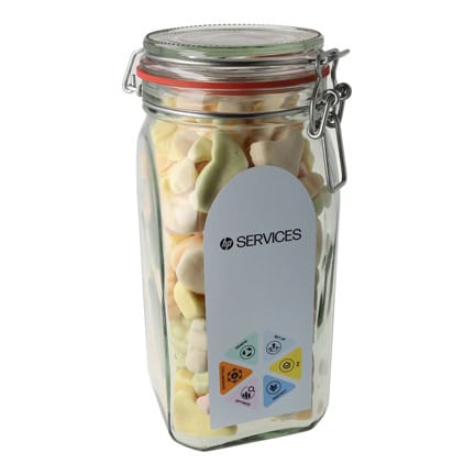 Deze vierkante glazen snoeppot heeft een robuuste uitstraling, gevuld met chocolade paaseitjes is dit een stoer Paasgeschenk. Door de spansluiting incl. rubberen ring blijft de inhoud lekker vers. Maar pas op, de pot is zo leeg! Gelukkig is de snoeppot navulbaar, er is keuze genoeg in onze vullingen. Uw bedrijfsnaam, logo of slogan kan in full colour worden opgenomen op 1 zijde van de weckpot. Daarmee blijft u goed in zicht bij uw klanten en zakenrelaties.