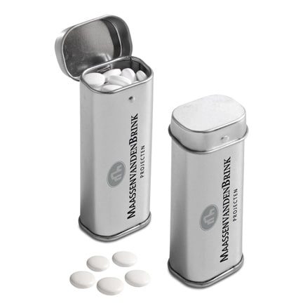 Hersluitbaar hoog Pepermuntblikje gevuld met frisse pepermuntjes incl. ingrediëntensticker en seal. Lekker lang houdbaar, wel 36 maanden,  dus handig om dit artikel op voorraad te hebben als weggevertje. Bedrukt met uw bedrijfslogo is dit echt een blikje om te bewaren!