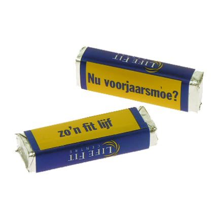 Geen rond pepermuntrolletje? Kies dan voor een vierkant (rechthoekig) ‘rolletje’ pepermunt. All-over full colour bedrukt met uw bedrijfsontwerp en logo is een pepermuntpakje een lekker fris weggevertje! Dit pepermuntrolletje is tevens te combineren met een vierkante vouwkaart. Of gebruik de pepermuntpakjes als promotiemateriaal tijdens een beurs of als vulling van uw gepersonaliseerde snoeppot of snoepblik, dat is dubbel reclame!