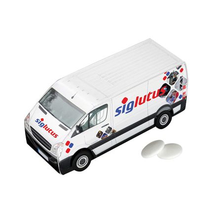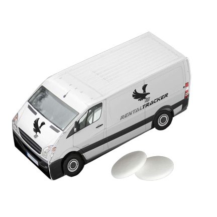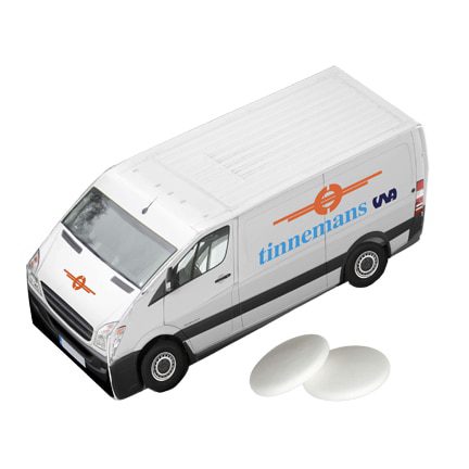 Gepersonaliseerde bestelbus gevuld met imperiale pepermunt, bedrukt naar wens met uw eigen bedrijfsontwerp als relatiegeschenk voor uw klanten. Deze bestelbus rijdt zo uw bureau op!