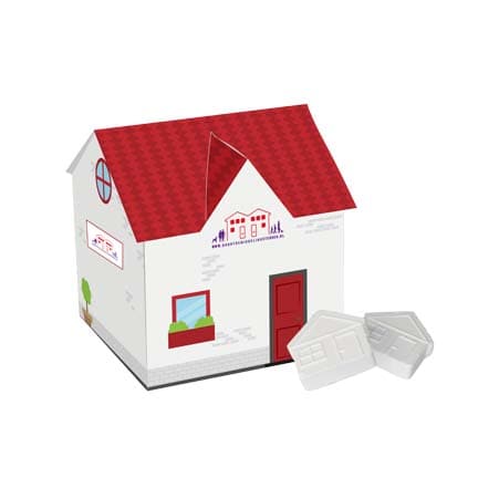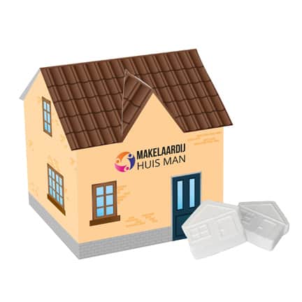 All-over full colour bedrukt huisje gevuld met ca. 45 gram frisse huisjes pepermunt. Dit huisje leent zich uitstekend om cadeau te doen voor een makelaar bij de verkoop van een huis, of bijvoorbeeld voor een bouwbedrijf bij de oplevering van een pand. Gepersonaliseerd met uw bedrijfslogo is dit een echte eye-catcher!