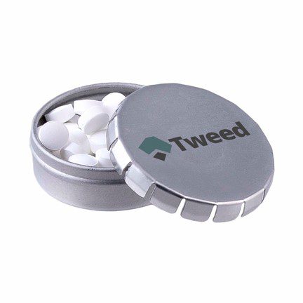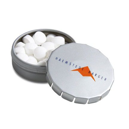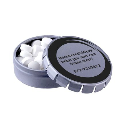Klein klikblikje met ca. 5 gram mini pepermuntjes incl. ingrediëntensticker en seal. Dit Pepermuntblikje leent zich goed om op voorraad te nemen want de houdbaarheid is 36 maanden. Bedrukt met uw bedrijfslogo is dit een lekker fris weggevertje voor op een beurs of evenement.