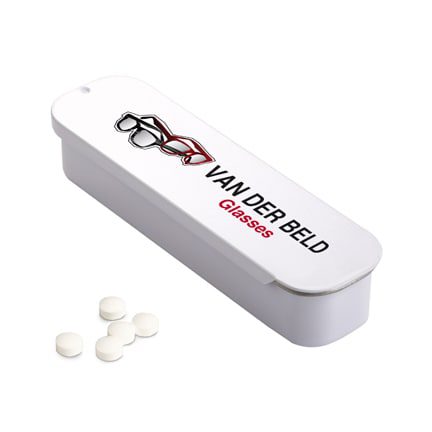 Lang slidy blikje gevuld met ca. 11 gram mini pepermuntjes incl. ingrediëntensticker en seal. Bedrukt met uw bedrijfslogo is dit hersluitbare blikje handig om op voorraad te nemen, want de houdbaarheid is lekker lang, 36 maanden.