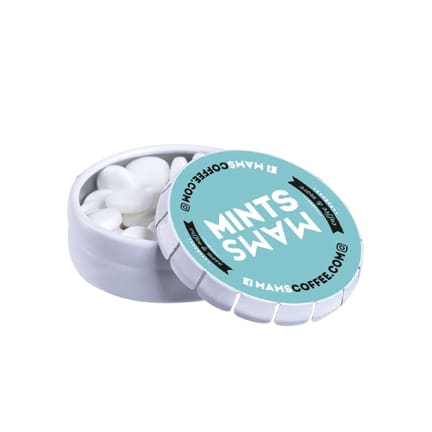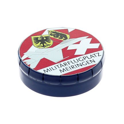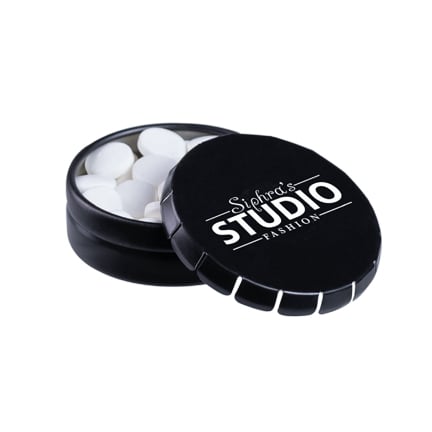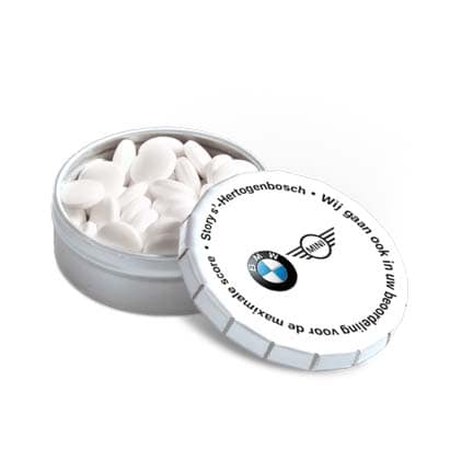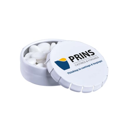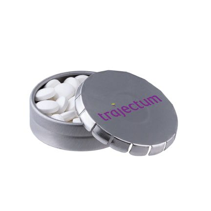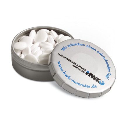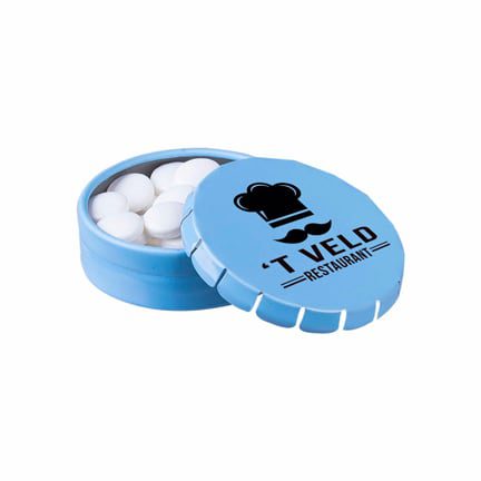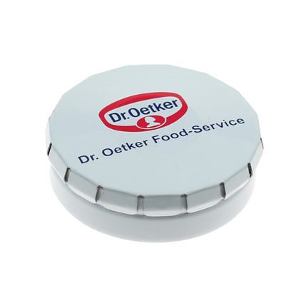 Rond clic-clac Pepermuntblikje gevuld met ca. 12 gram pepermuntjes incl. ingrediëntensticker en seal. De bedrukking met uw bedrijfslogo vindt rechtstreeks op de deksel van het blikje plaats.