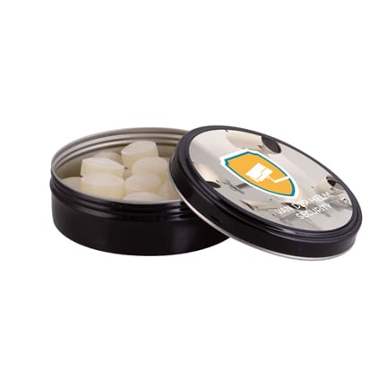Gepersonaliseerd Snoepblikje bedrukt met uw bedrijfslogo & promotietekst in kleur rechtstreeks op de deksel.