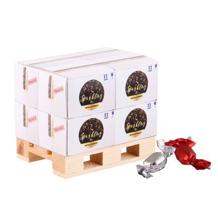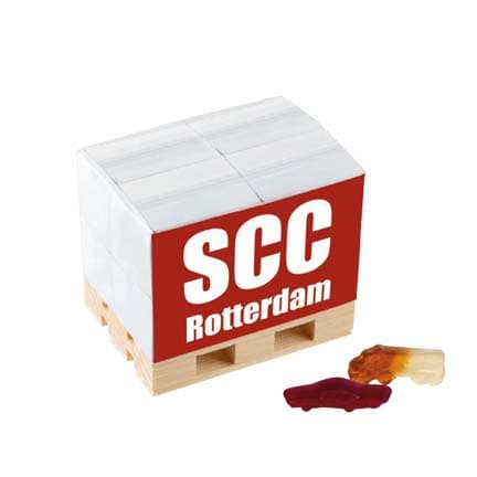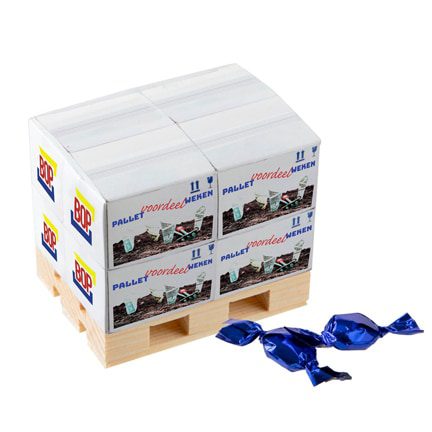 Als transportbedrijf op zoek naar een stoer weggevertje? Kies voor micro pallets gevuld met ca. 80 gram metallic sweets. Op de pallet wordt 1 doos geplakt, die als ‘meerdere doosjes’ bedrukt kunnen worden, zo is uw bedrijfsnaam en logo goed in beeld.