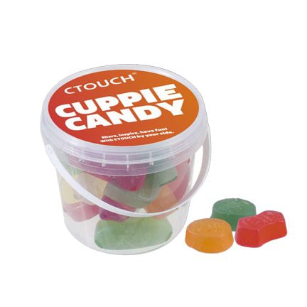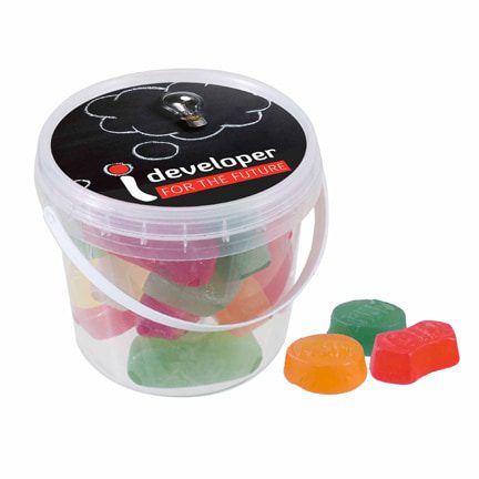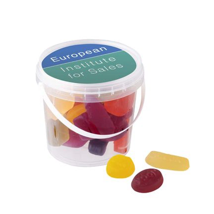 Transparant Snoepemmertje autodrop als give-away aan toekomstige klanten en relaties. De deksel van het emmertje wordt naar wens full colour bedrukt middels een sticker.