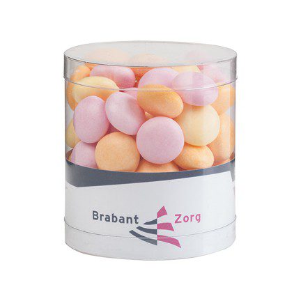 Transparante Snoepsilo met een bedrukte wikkel aan de binnenzijde. Gepersonaliseerd met uw logo & reclametekst als promotiemiddel.