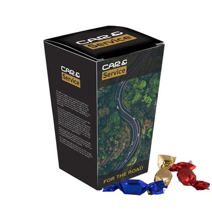 Full colour bedrukt Snoepdoosje passend in autobekerhouder, gevuld met Autodrop & gepersonaliseerd met uw logo en bedrijfsgegevens.