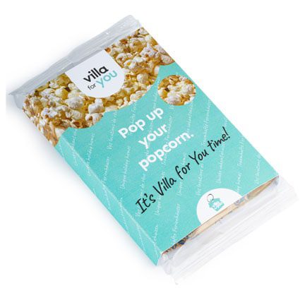 Zoete of zoute magnetron popcorn in een full colour bedrukte sleeve, gepersonaliseerd met uw eigen logo & promotietekst.