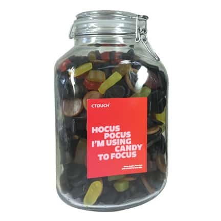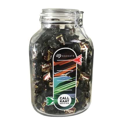 Dat is nog eens een binnenkomer bij uw klanten, deze glazen Weckpot met maar liefst een inhoud van ruim 4 liter! Gevuld met vrolijke zuurtjes of toffees is dit een snoeppot van formaat. Bedrukt met uw bedrijfsnaam, logo of slogan is dit een imposant relatiegeschenk.