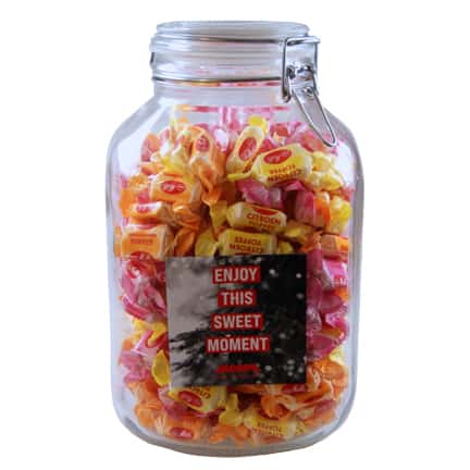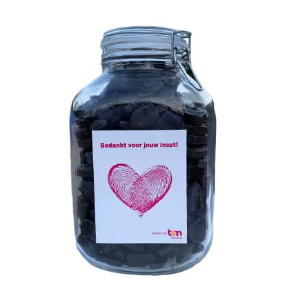 U kunt de snoeppot ook vullen met gepersonaliseerde vruchtentoffees, zuurtjes of pepermuntrolletjes. Dan is uw naam dubbel in beeld!