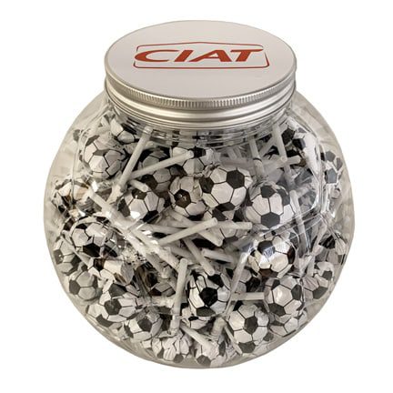Grote voetbal snoeppot als sportief relatiegeschenk. Gepersonaliseerd met uw bedrijfslogo op de aluminium schroefdeksel en gevuld met lekkers naar keuze. De voetbalpot is gemaakt van kunststof, dus kan tegen een stootje. Het eindresultaat is een ware eye-catcher en een sportief promotiemiddel!