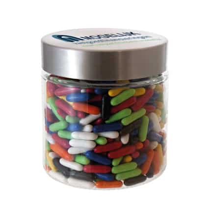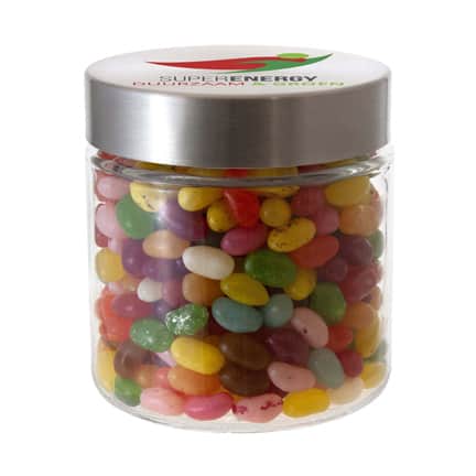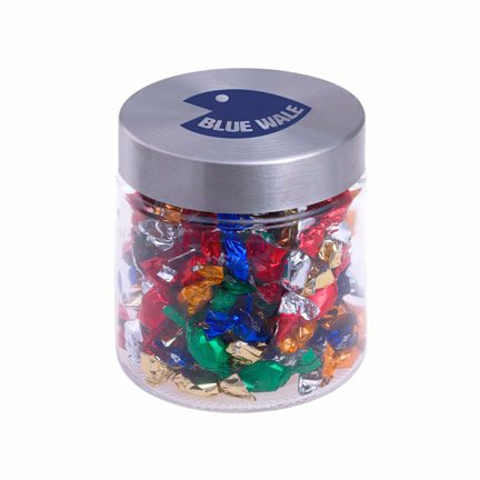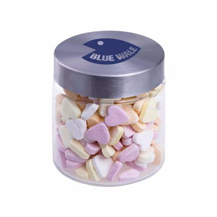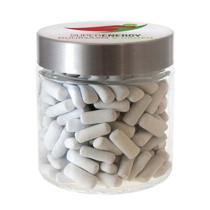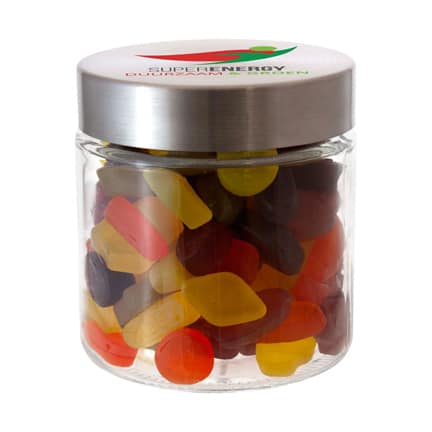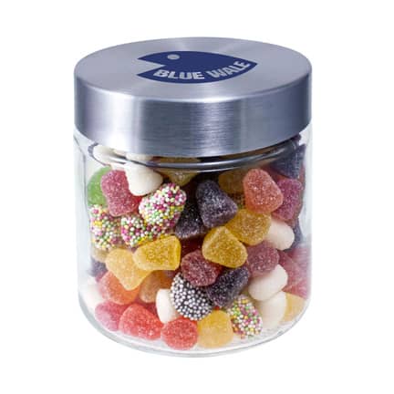 Robuuste glazen Snoeppot met RVS schroefdeksel, gevuld met lekkers naar keuze. Deze snoeppot met stoere uitstraling kan bedrukt worden met uw logo of bedrijfsnaam als relatiegeschenk.